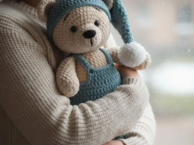 Meet Barni! A soft, huggable teddy designed for sweet dreams. Featuring charming blue overalls and a signature long nightcap, Barni is a polished, gift-worthy project that photographs beautifully and makes for an irresistible "market make."